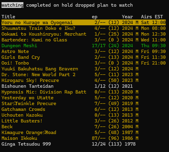 TUI application written in Python with curses to help keep up with both current and old anime.