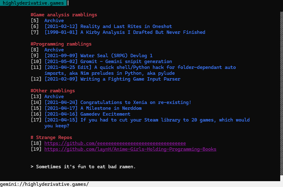 Using the gemini protocol (a tiny alternative to http), hosted with jetforce, I run a blog on this same domain. It's mostly writing from 2021, mostly nerdy ramblings about games or programming.